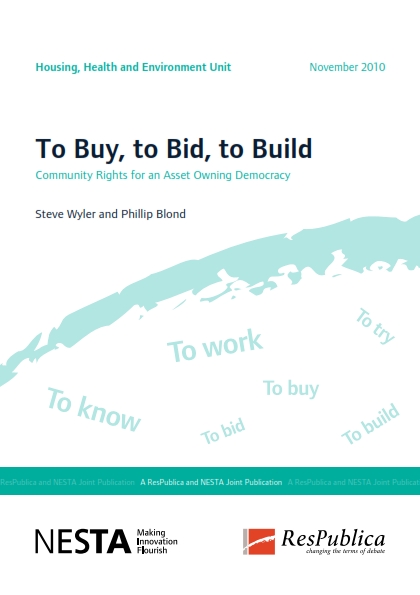 November 15 2011 saw the launch of ResPublica’s latest report, To Buy, To Bid, To Build: Community Rights for an Asset Owning Democracy, co-authored by its Director, Phillip Blond, and Development Trusts Association Director, Steve Wyler, in association with NESTA.